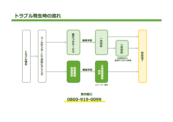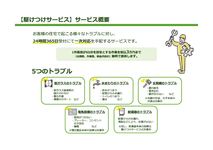 24時間365日の修理受付し、60分以内を目安に一次対応する駆け付けサービスもあります。